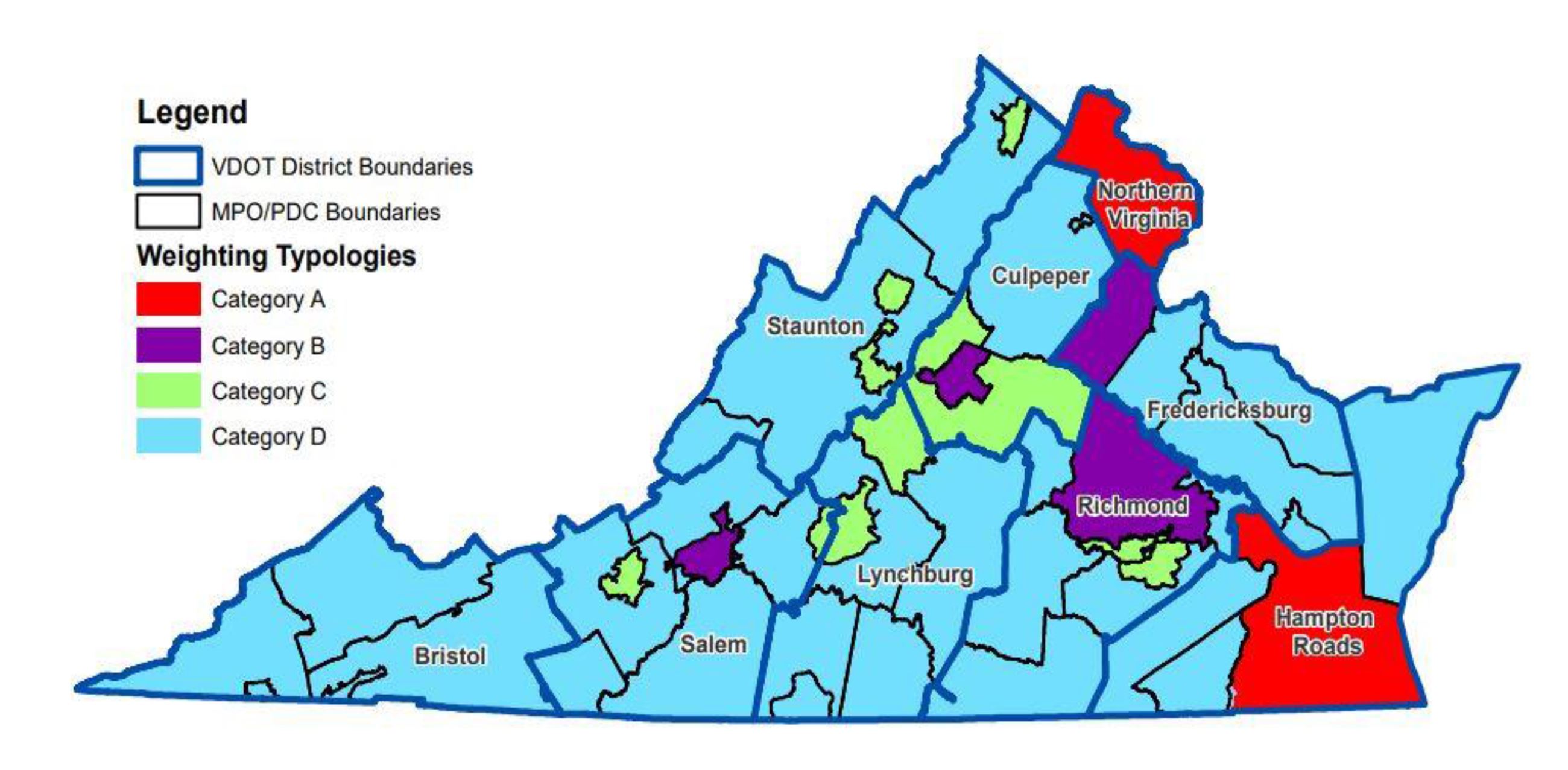 The legislation that resulted in SMART SCALE specifies that the CTB shall weigh the evaluation factors for each of the state's nine VDOT Construction Districts, assigning different weights to the factors based on the unique needs and qualities of each District. The figure below shows the SMART SCALE weighting typologies, or frameworks, for the nine construction districts. Several of the construction districts have more than one SMART SCALE weighting typology.